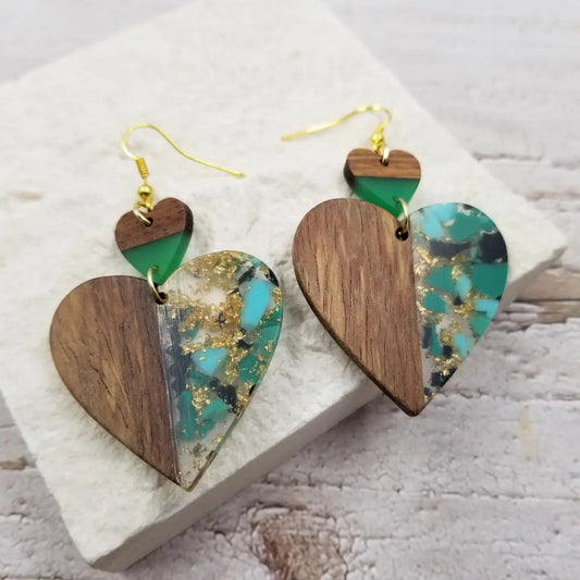 Gold Flake Acrylic Wood Drop Double Heart Earrings