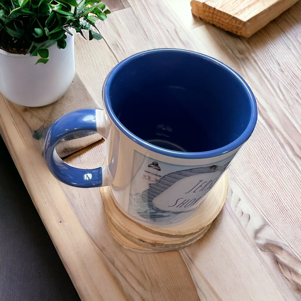 - White Ceramic Mug with Blue inside and handle. Image on both sides
