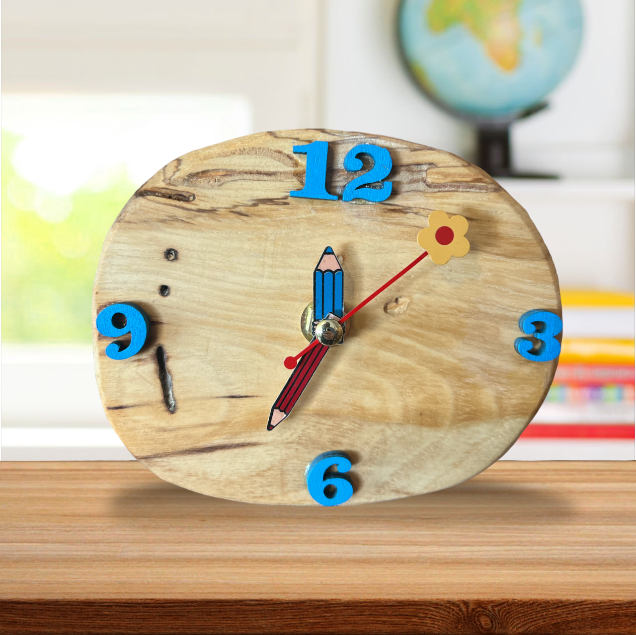 Handmade adorable olive wood desk clock. Pencil hands and flower second hand. Makes a Great Mother's Day or Teachers Gift. 5-1/4"x4-1/2"