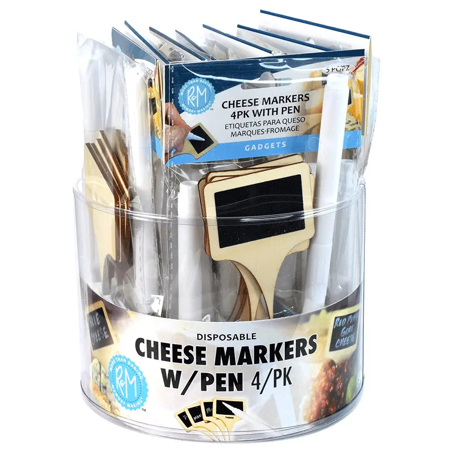Set of 4 cheese markers includes a chalk marker to easily identify your cheese selection for guests. Made of wood with a chalkboard finish on one side for handwriting. Add the finishing touch to your cheese platter or charcuterie board. Great for desserts too! Just use a damp cloth to remove chalk marker writing and reuse them again. Stylish sign shape is 3.25” x 2.25”.