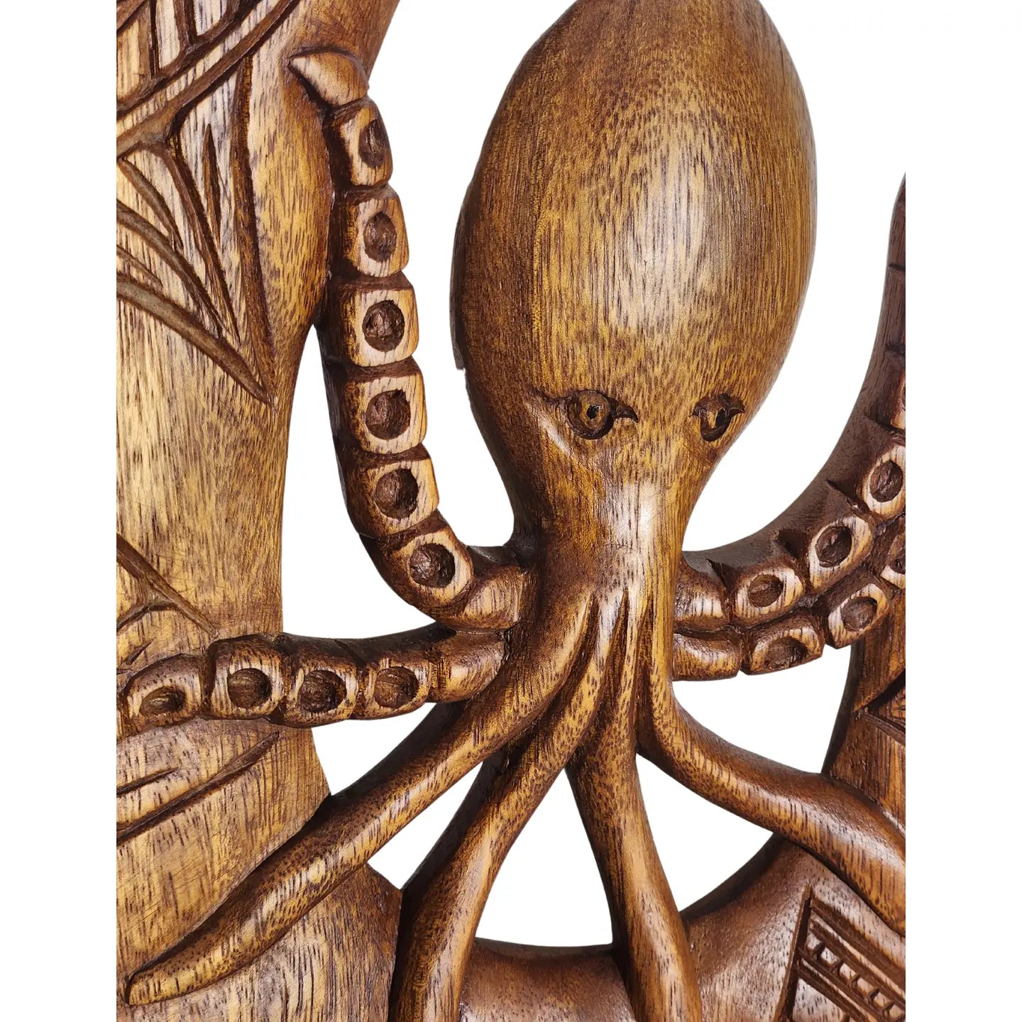 THIS HANDMADE HOOK WITH OCTOPUS WALL ART IS BRILLIANTLY HAND CRAFTED AND DETAILED BY OUR OWN MASTER CRAFTSMEN. SIZE IS 16"H X 10.5 X 1. ALL CARVINGS ARE HANDMADE, PLEASE ALLOW FOR SMALL VARIATION IN SIZE AND COLOR. WOOD IS MAHOGANY