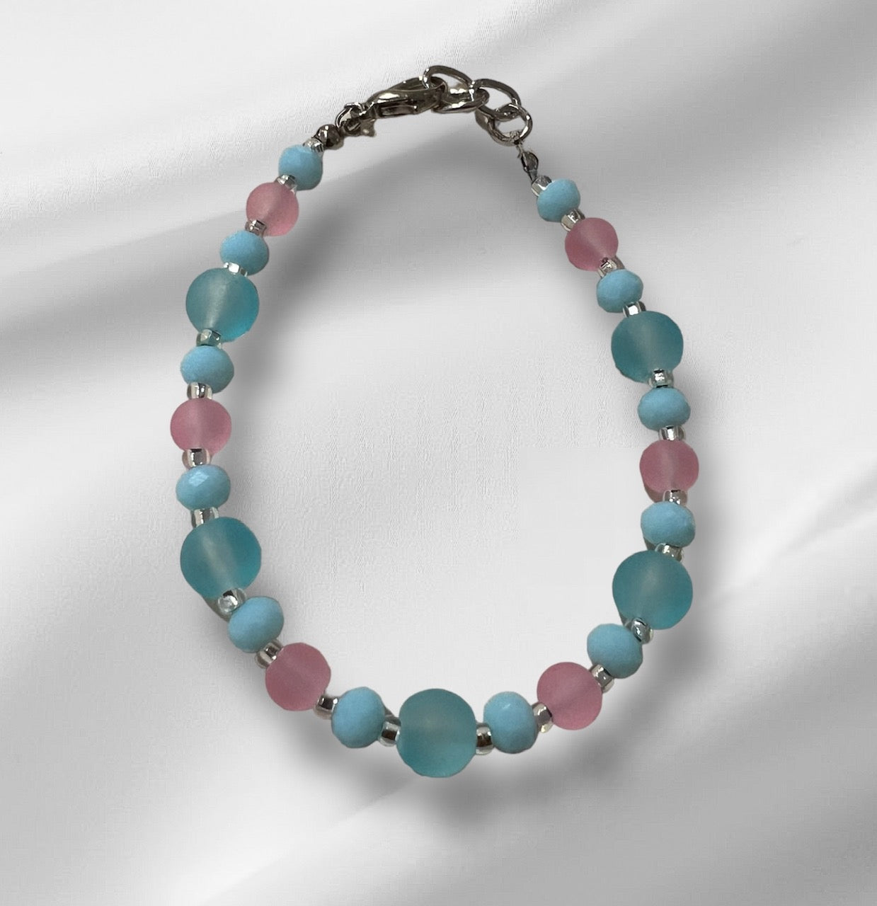 Handmade Seaglass/Glass Adjustable Bracelet with Pastel Colors. 8mm light blue & 6mm light pink Seaglass beads. Make gift-giving a breeze with our pre-gift-wrapped handmade jewelry for women. Our sea glass bracelet is ready to surprise and delight, whether it is Mother's Day, Birthday, Valentine's Day or Christmas. Comes in mesh gift bag.