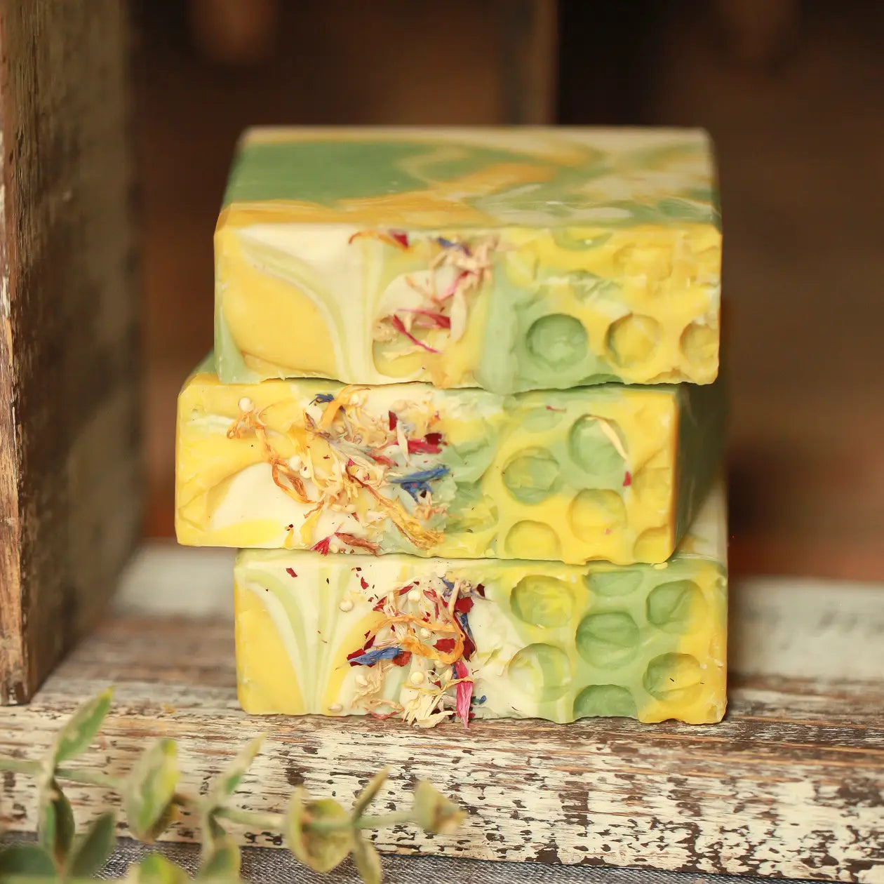 Cold process soap is made with fully saponified oils of Olive, Homogenized Palm, Organic Coconut, Unrefined Shea Butter, and Castor, Sodium Citrate, Kaolin Clay, Premium Fragrance Oil, Vegetable Glycerin, Titanium Dioxide, Mica, Sugar, Sea Salt, Dried Botanicals.
