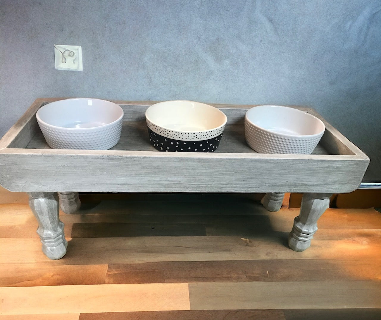 Elevated Pet Tables - Pet tables should be raised to the proper height for your pet's comfort and proper consumption. Our pet tables are custom built to order and can be made to fit most feeding bowls. The table deck is protected by floor tile and then varnished with clearcoat, so food and water does not damage wood surface. Table itself is made of pine wood. All our tables are Custom Made and will take two weeks to ship.