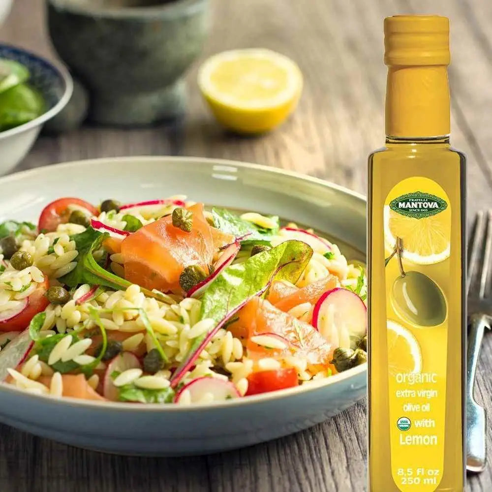 Pair your olive oil with a delicious pasta here! A Taste of Italian Tradition Through the generations, the Mantova family has become recognized as premier testers and tasters, curating only the finest oils to bear the family name. Mantova proudly offers an organic, 100% natural, cold-pressed extra virgin olive oil, infused with all-natural lemon flavor. It maintains its flavor integrity up to medium heat, so it is a great choice for pan frying or sautéing. It’s quick and easy to add authentic Italian flavor to any dish. Brighten and enhance fruits, vegetables, fish pasta, salads, or desserts.