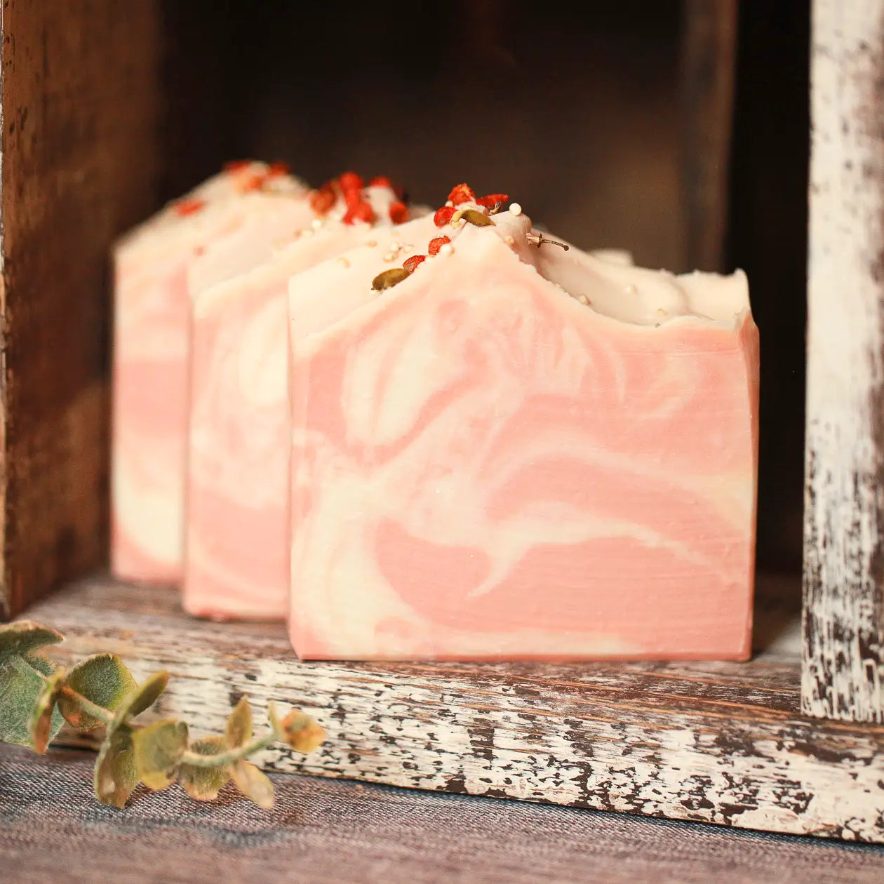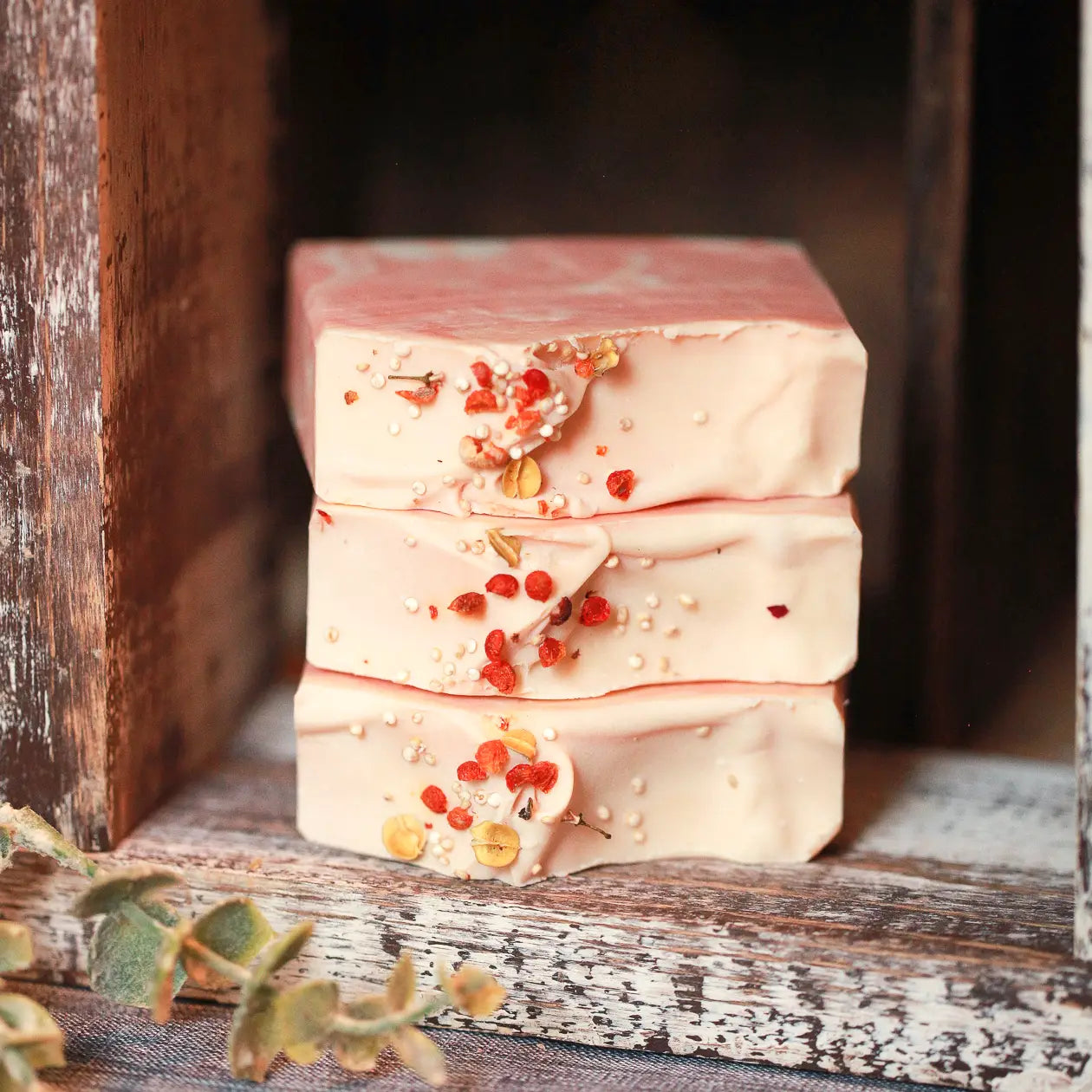 Cold process soaps made with fully saponified oils of Olive, Palm, Organic Coconut, Unrefined Shea Butter, and Castor, Sodium Citrate, Kaolin Clay, Premium Fragrance Oil, Titanium Dioxide, Mica, Sugar, Sea Salt, and Botanical Topper.