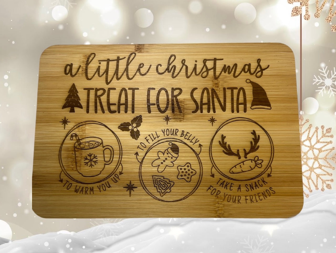 This adorable Bamboo Wood Board is for Santa and his friend's snacks and treats. Board measures 8-1/2"x6". Back side can be used as a chopping board.