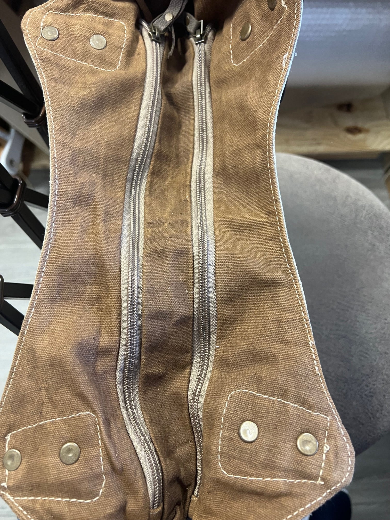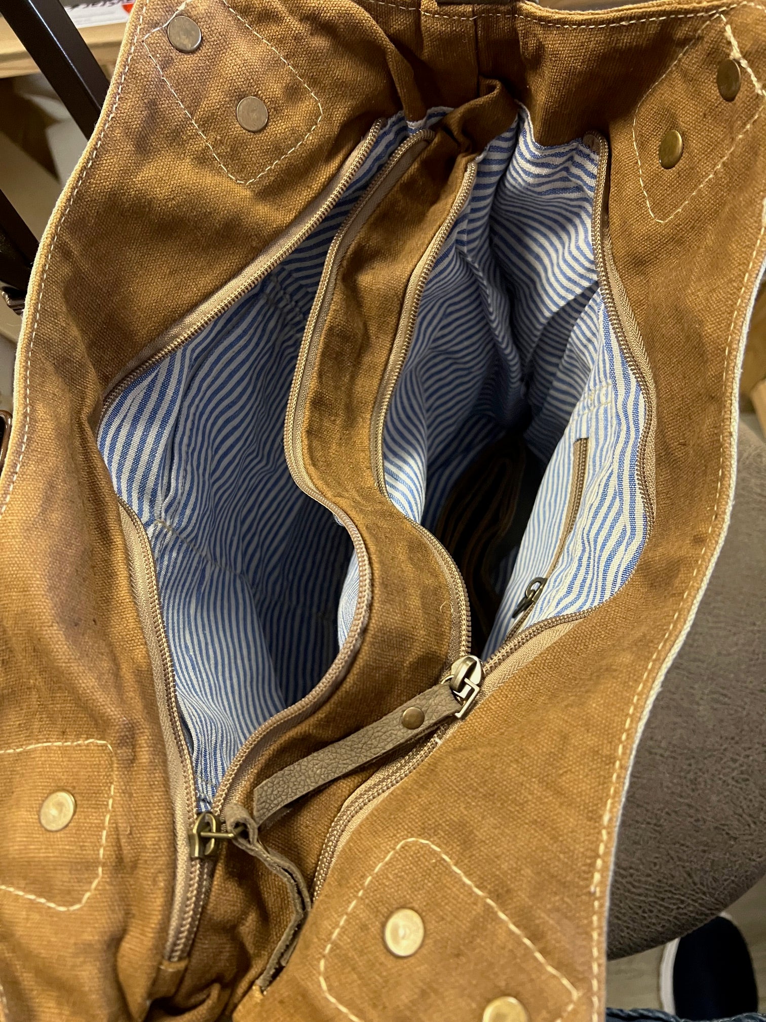 Signature canvas body. - Double-zipper exterior through-pocket; Navy blue pinstripe interior - two interior slip pockets and one zipper Pocket, Exterior Zipper pocket and large snap pocket- Removable adjustable leather strap - Antique brass metal hardware